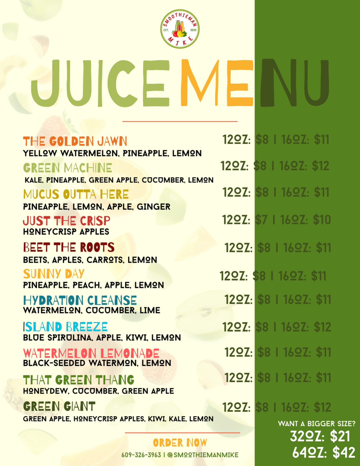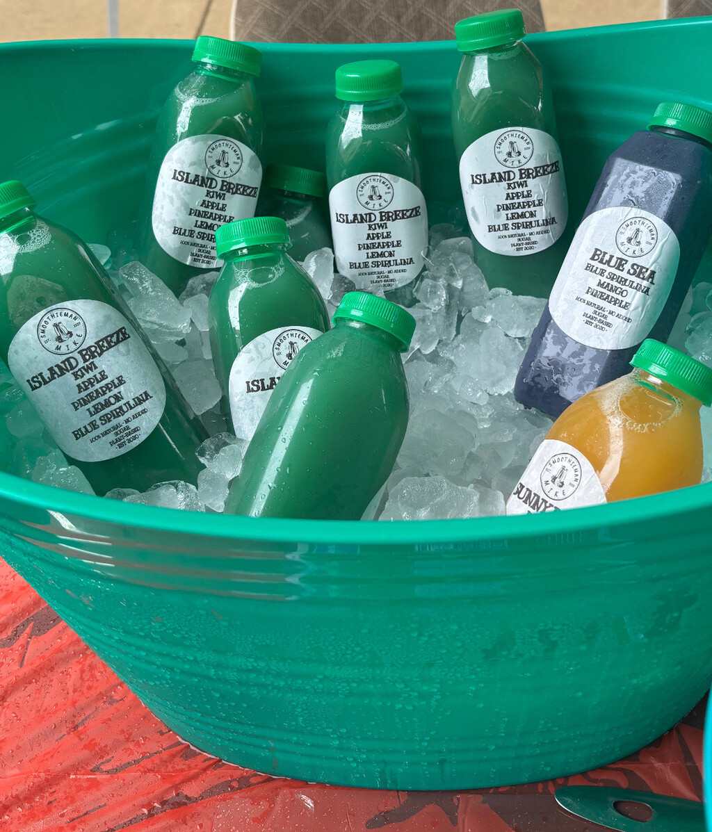 Our smoothies have a coconut water and raw agave base which makes them light and sweet. They come in two sizes (12 oz and 16 oz) and you can add extras like sea moss, hemp seeds, chia seeds, and much more. Our juices come in six different sizes, from 12 oz to 64 oz. Please see the menu below for all the yummy details.